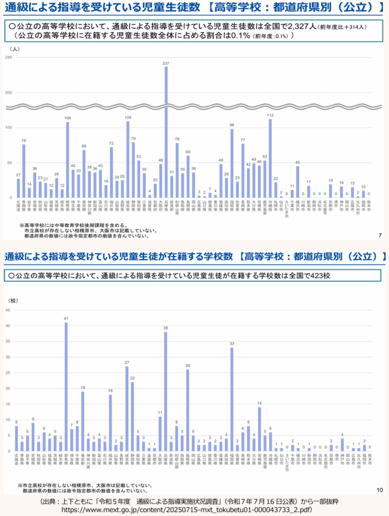 公立の中学校において、通級による指導を受けている児童生徒数が全国で34,393人(在籍生徒数に占める割合は1.2%)であるのに比べると、かなり数が少ないことから、高等学校で十分な指導を受けることができない生徒も潜在的に多くいるのではないかという指摘もされています。