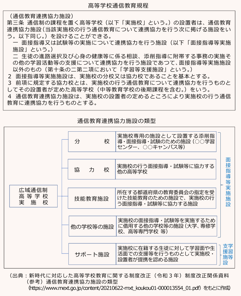 文部科学省は、高等学校通信教育の質の確保・向上を図る観点から、令和3年3月に「高等学校通信教育規程」を改正し、従来「サテライト施設」と呼ばれていた施設を「通信教育連携協力施設」として法的に位置づけました。