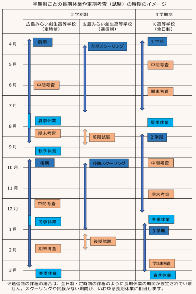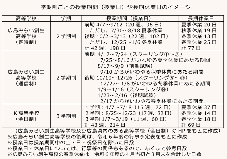 2学期制は、3学期制と比べて定期試験の回数が少なくて済み、授業時間数を確保しやすいなどの理由から、広島県の公立の高等学校では、一時期、2学期制をとる学校が増えました。しかし、実際に2学期制にしてみると、3学期制と比べて定期考査の間隔が広くなる分、必然的に定期考査の出題範囲も広くなり、細かな学習の定着度が測りにくいなどの理由から、3学期制へ戻す学校も出てきました。