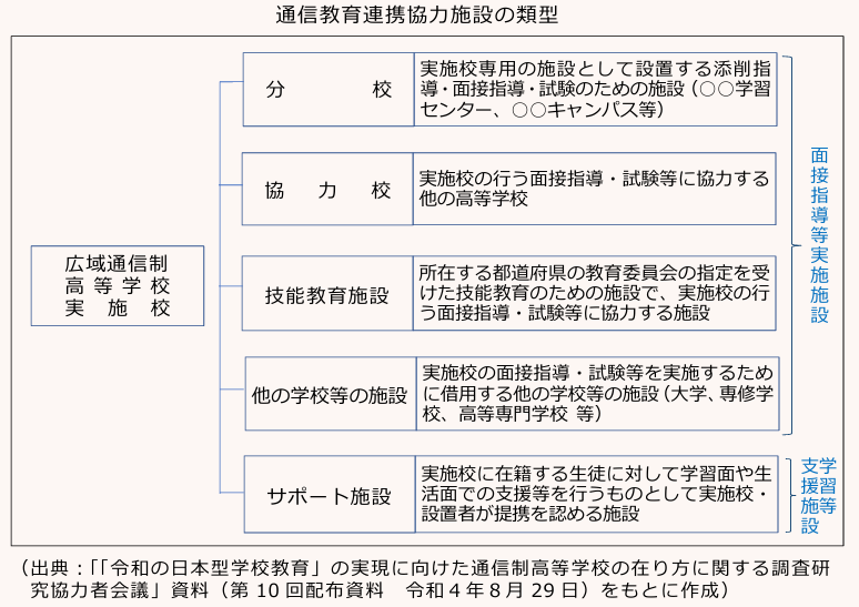 これにより、通信教育の実施における施設の役割や基準が明確化され、通信制の課程の高等学校を卒業するために必要な面接指導(スクーリング)や試験等を行う施設(「面接指導等実施施設」)と、面接指導以外の生徒の日常的な学習支援、進路選択に係る相談等を行う施設(「学習等支援施設」)は明確に区分されることになりました。