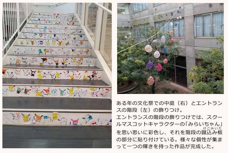 しかし、これまでに、ステップラウンジやエントランスホールの飾りつけなどを通信教育コースの生徒全員で協力しながら製作してきました。生徒一人一人の個性は様々ですが、それらの個性が一つに集まってできる作品はとても輝きをもったものとなります。