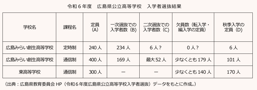 次に、「二次選抜での入学者数(C)」は、「二次選抜の志願者数」や「秋季入学の定員(D)」からの類推となります。広島みらい創生高等学校の「秋季入学の定員(D)」は「定員(A)」の外数として定時制の課程は6人、通信制の課程は30人の枠がありますが、「定員(A)」まで入学者がいなかった場合は、その欠員数も加えた数が「秋季入学の定員(D)」となります。