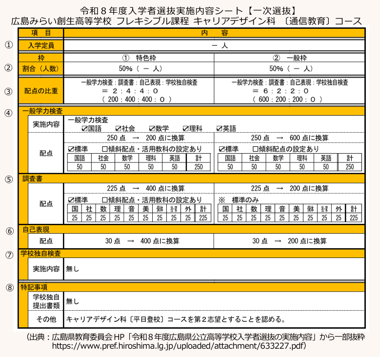 これだけでは、ちょっと分かりにくいので、広島みらい創生高等学校の通信教育コース(通信制の課程)の「入学者選抜実施内容シート」をもとに説明します。(次の①~⑧は、上表の左端の番号に対応しています)