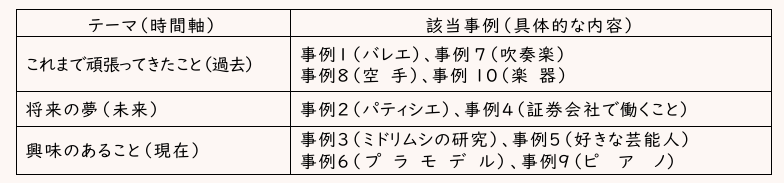 「これまで頑張ってきたこと」は、時間軸でいうと「過去」をテーマとした内容、これに対して、「将来の夢」は「未来」、「興味のあること」は「現在」をテーマとした内容といえます。