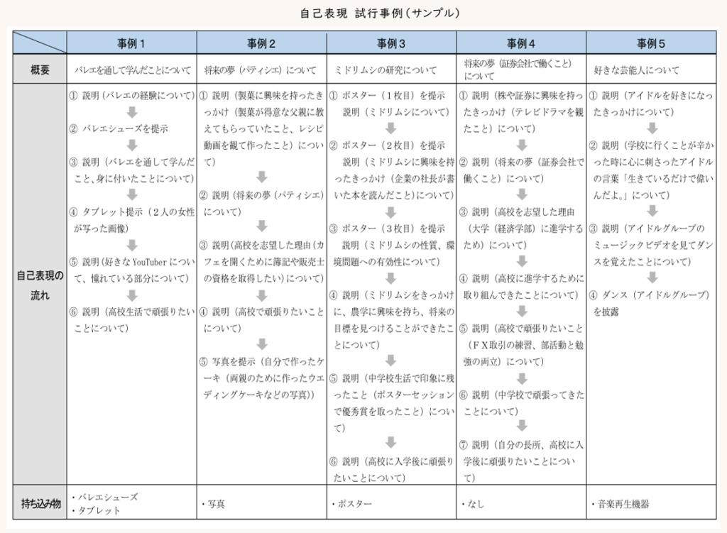 つまり、事例のとおりに自己表現を行ったからといって、高評価(高得点)が保証されるわけではないということです。しかし、これらの事例は、テーマ選びや表現方法を考える際のヒントとして活用することができます。