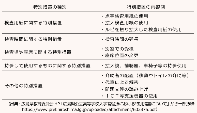 広島県教育委員会では、疾病や障害などの理由で特別な配慮が必要な場合、申請に基づいて受検者一人ひとりの状況を検討し、次のような特別措置を受けることができるよう定めています。