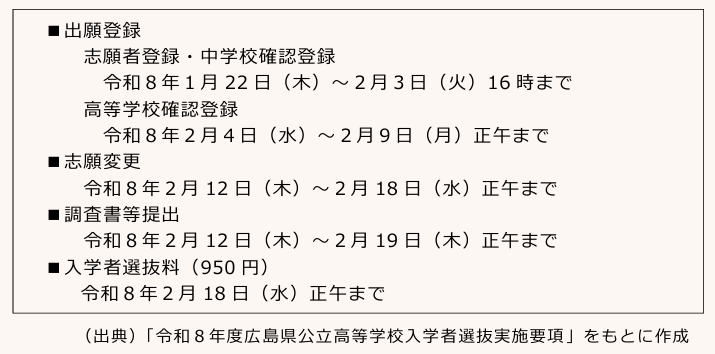 令和8年度 広島県公立高等学校入学者選抜の出願登録が、いよいよ始まります。期間等は次のとおりです。