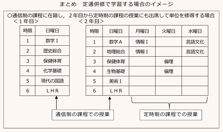 これは、第2章(2-10)で概要のみを説明した「定時制課程及び通信制課程の併修による単位認定」と呼ばれるもので、「①通信制の課程の生徒が、自校の定時制の課程又は他校の定時制若しくは通信制の課程において一部科目の単位を修得した場合、②定時制の課程の生徒が、自校の通信制又は他校の通信制の課程において一部科目の単位を修得した場合、当該校長の定めるところにより、その単位数を自校の卒業に必要な単位数に含めることができる」制度です。