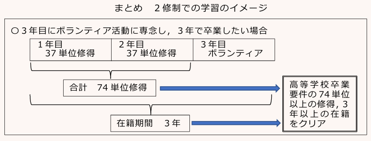 この2修制は、新規に高等学校に入学し、3年目は1年間登校せずにボランティア活動に従事してみたいとか、海外に行って見聞けんぶんを広めてみたいとか、図書館などで自分の好きな教科の勉強だけをしてみたいという生徒も、はじめの2年間で74単位を修得していれば、最後の1年間は在籍しているだけで、3年での卒業が可能となります。