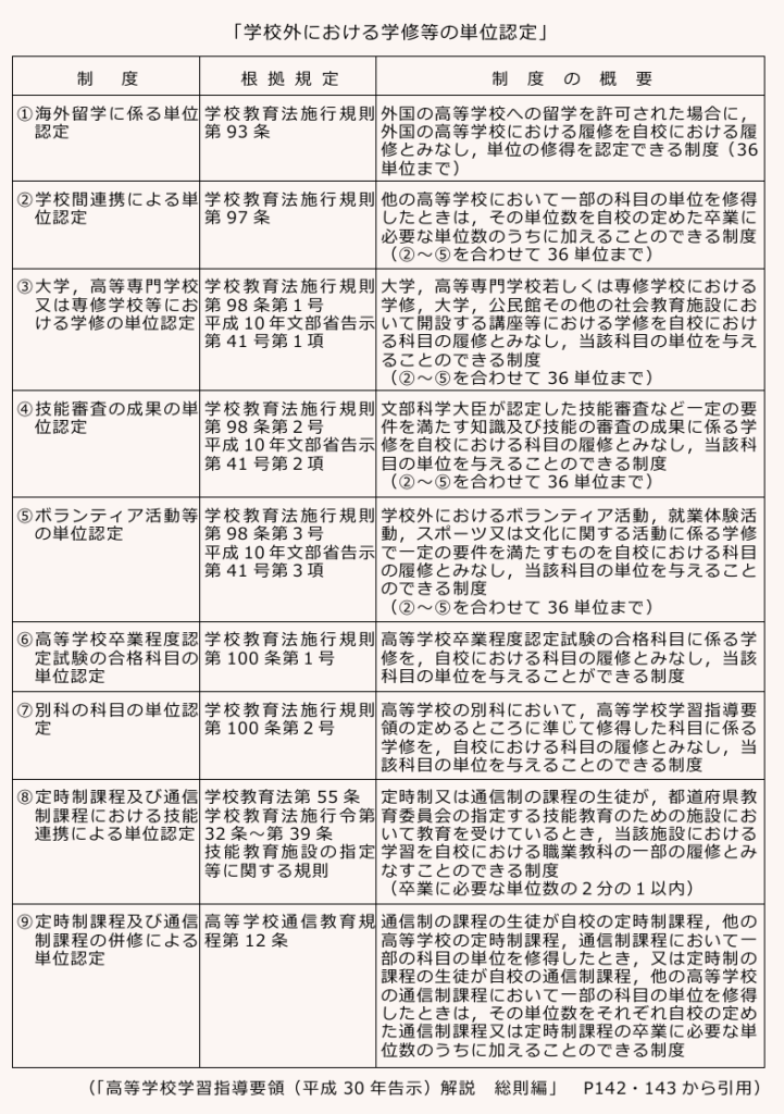 以上、高等学校学習指導要領で定められている「学校外における学修等の単位認定」の制度の概要について説明してきましたが、参考までに、次に高等学校学習指導要領に整理されている一覧を掲載しておきます。