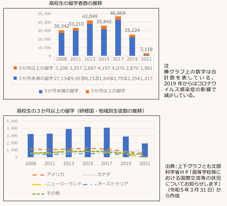グローバル化の進展で、海外へ留学する高校生は、2008(平成20)年度から2017(平成29)年度の10年間に30,342人から35,842人へと約1.2倍に増加し、このうち、3か月以上の留学については、3,208人から4,197人へと約1.3倍にもなっています。