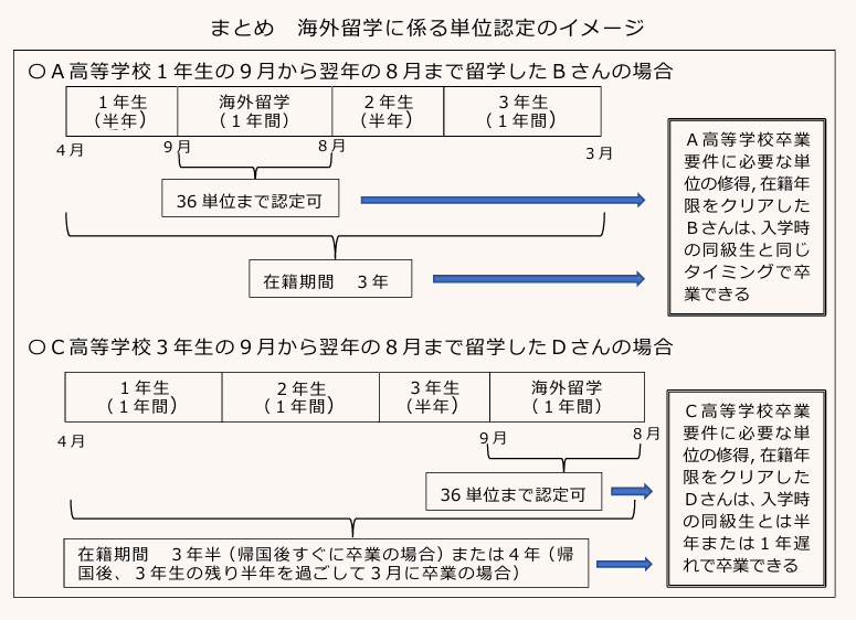 また、外国の高等学校は、日本と違って8月~9月入学、6月~7月卒業という制度をとっているため、学年をまたいだ場合の卒業時期はどうなるのかという不安もあるかもしれませんが、このことについても、高等学校学習指導要領では、「学年をまたがって留学した生徒については、留学が終了した時点において、学年の途中においても進級又は卒業を認めることができる」とし、長期の留学の場合でも、原級留置や休学する必要がなくなるとしています。