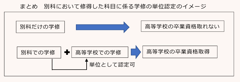 また、別科での学修を単位として認めるには、「別科における科目の履修が内容的にも、量的にも、高等学校における科目の履修に準じている」必要があり、別科での学修がすべて自校の単位として認められるというものではありません。